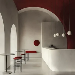 Great architecture lies in harmony. The most successful projects are those where color and material complement one another. A concrete ceiling paired with deep red furniture, or a stone wall with a bold emerald accent, creates a dialogue of contrasts. These combinations transform a static space into an experience—one that is not only seen but also felt.