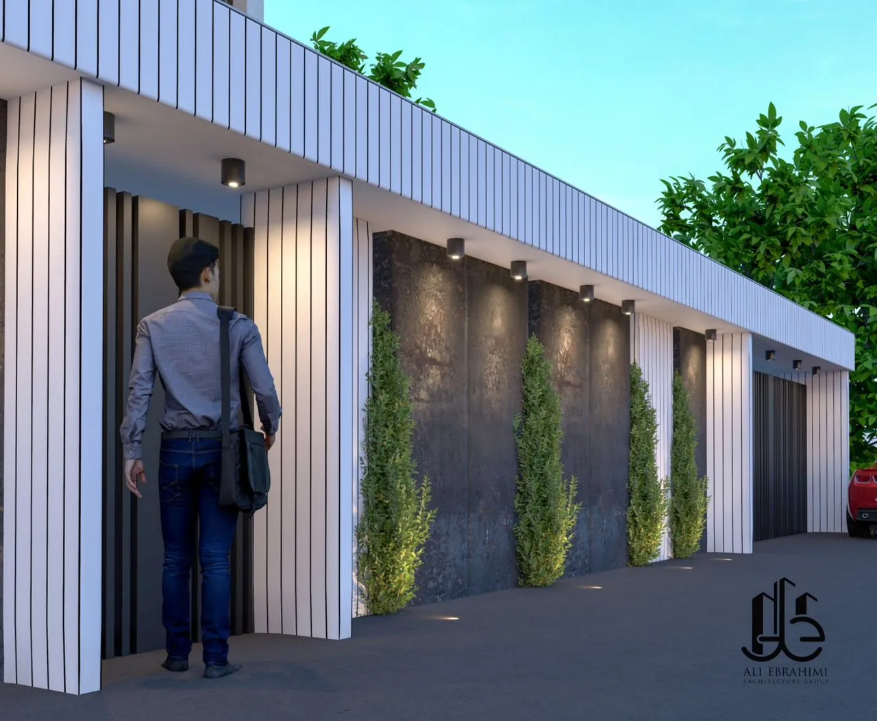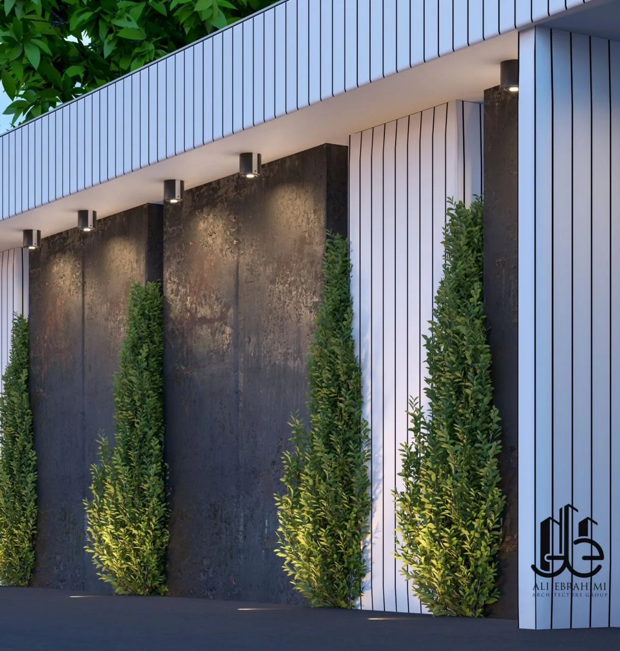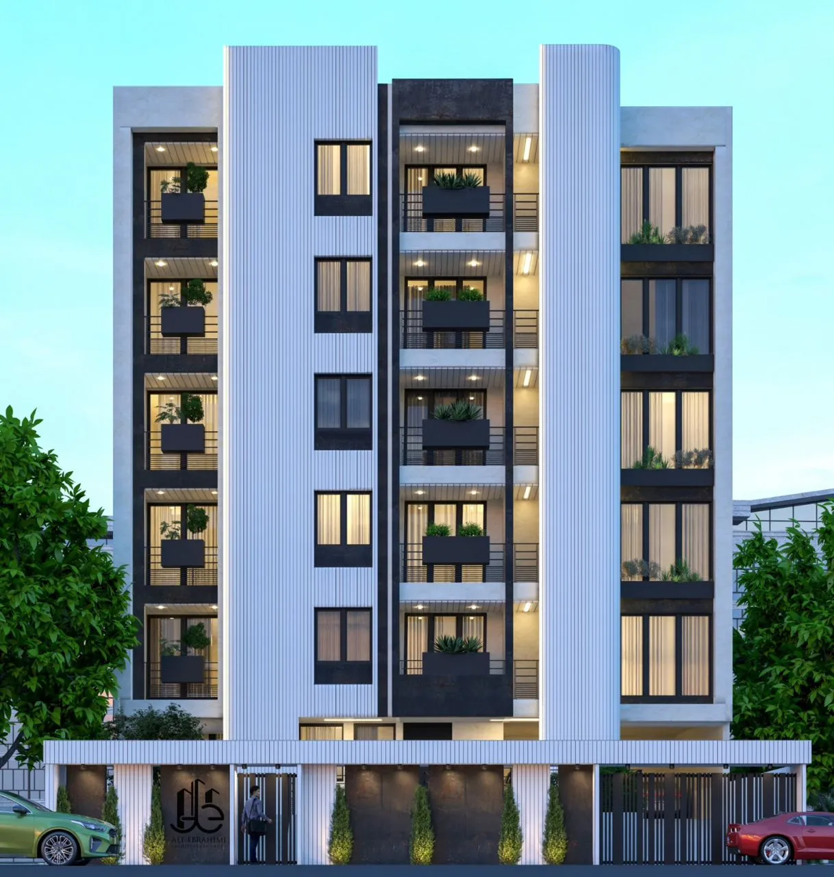Light plays a critical role in vertical-line residential architecture. Integrated linear LED lighting highlights the geometry of the white panels at night, transforming the facade into a luminous vertical sculpture. The entrance level features a controlled play of shadow, natural textures, and greenery, providing a human-scale experience that connects with residents and visitors.
