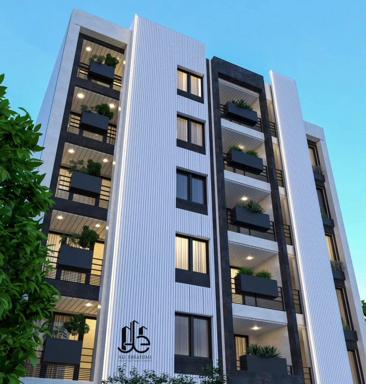 Linea Tower is a 1,300 sqm residential building in Shiraz featuring a vertical-line facade, defined by rhythmic white panels, deep balcony layers, and a precise interplay of light and shadow. The facade reflects harmony, proportion, and a modern urban presence, making it a standout in Shiraz’s residential architecture.