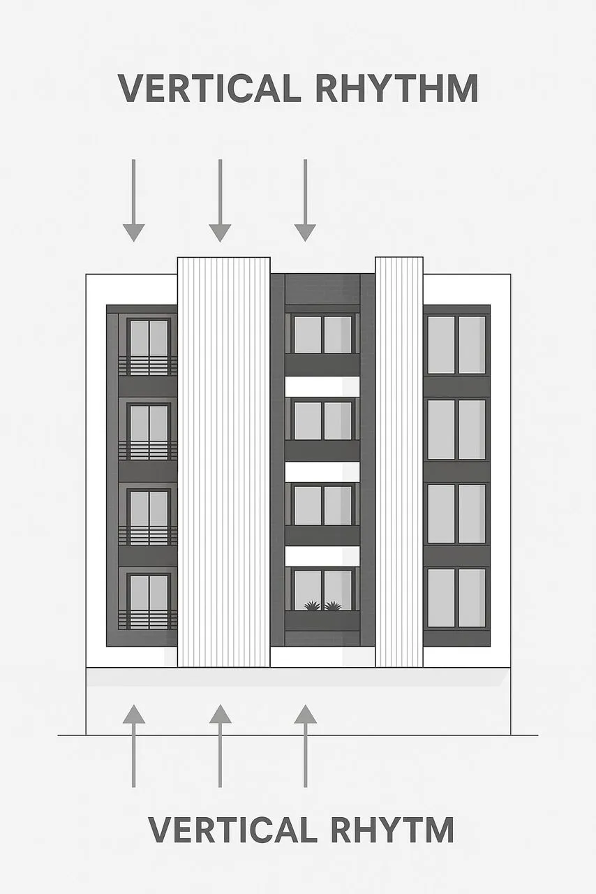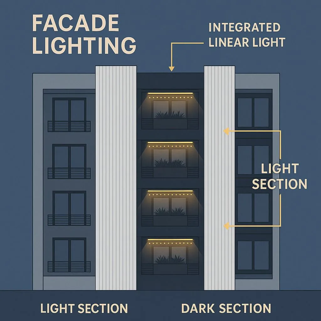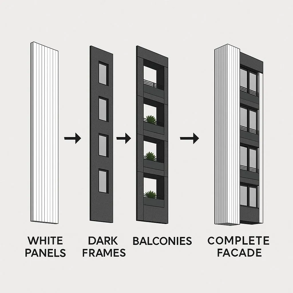 The residential facade was designed with construction feasibility in mind. Vertical panels follow a modular system for rapid installation and precise shadow lines. Dark structural elements utilize ceramic or stone slabs with minimal joints, while balcony ceilings integrate lighting channels for a seamless and high-quality appearance.