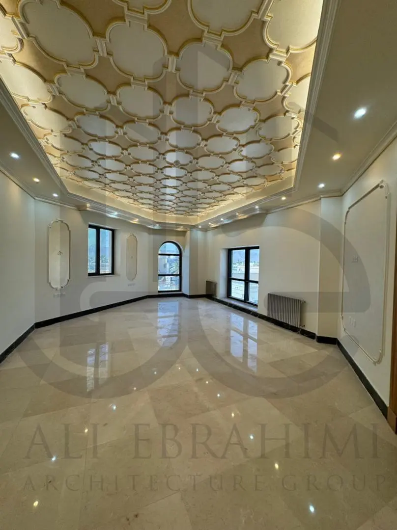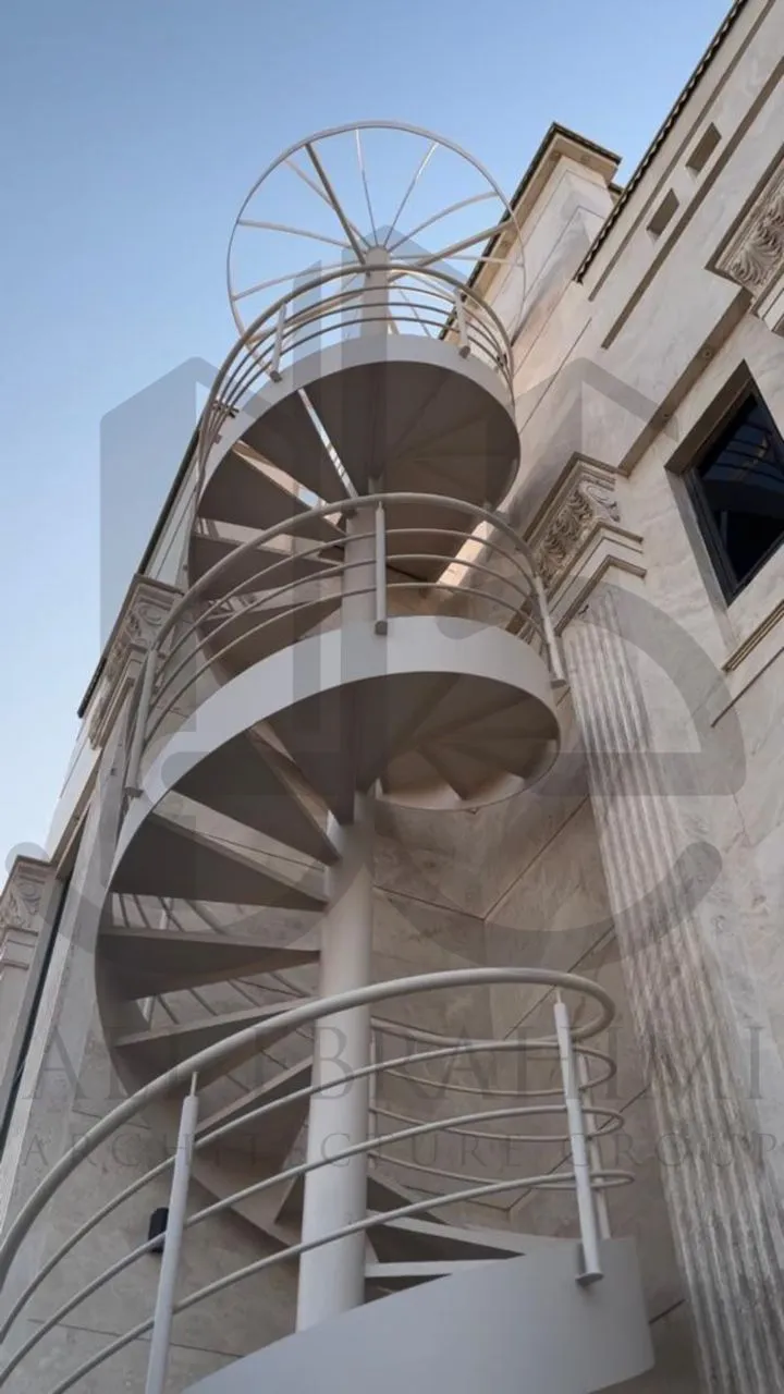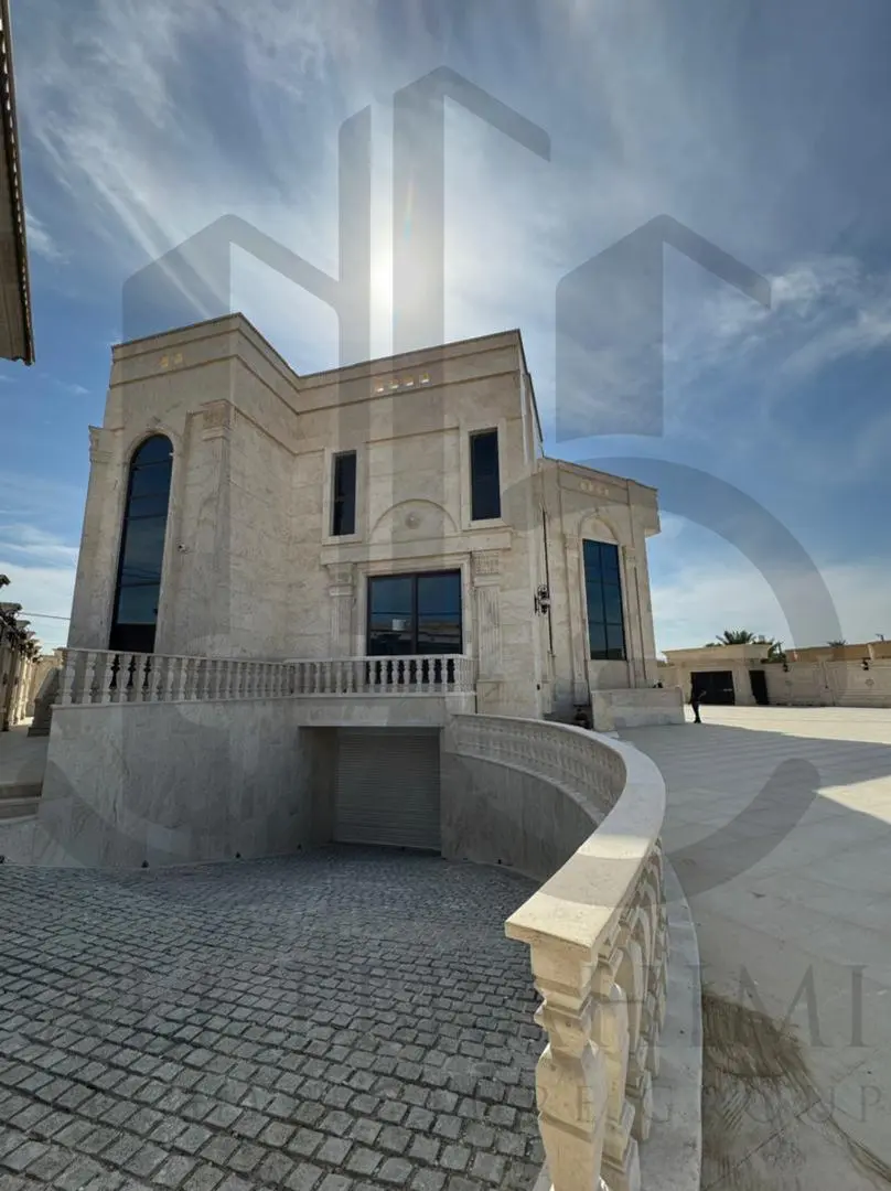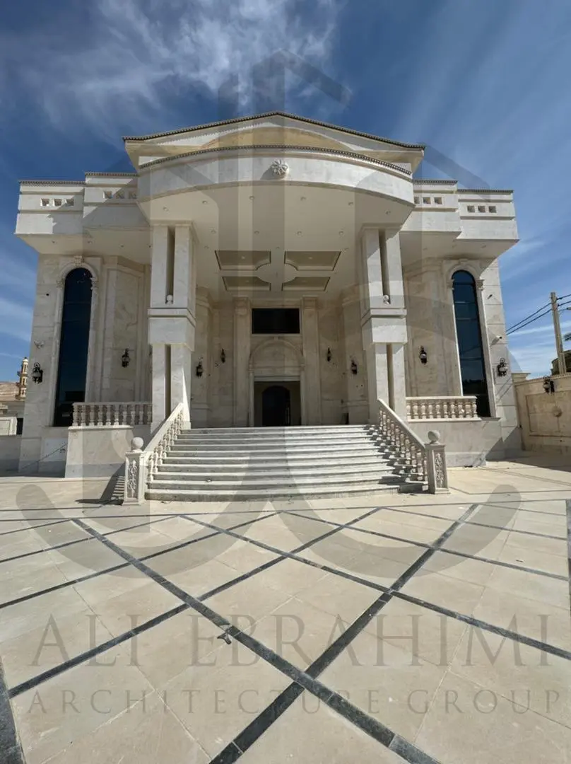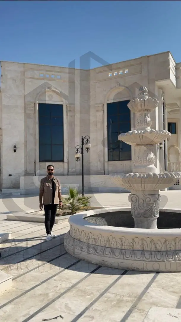 on a 1,300 sqm plot. Its four-sided façade, clad in white travertine stone
