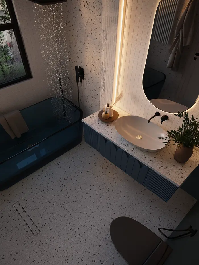 Modern Blue Harmony is a modern bathroom design project that combines deep blue tones, terrazzo stone, and warm linear lighting to create a space of tranquility, purity, and visual balance within a compact yet smart layout.